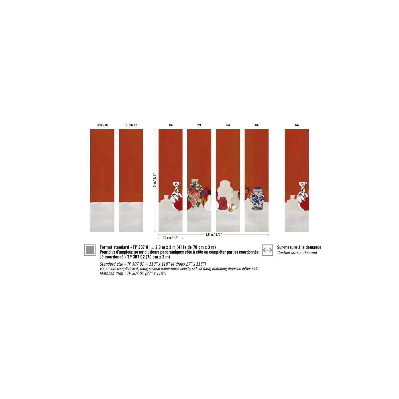 Panorámica estándar: 2,8 m x 3 m (4 paños de 70 cm x 3 m) Tamaño personalizado a medida bajo pedido