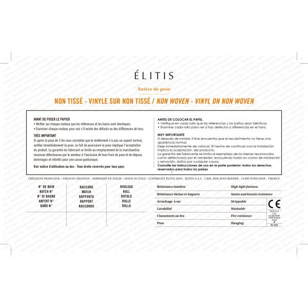 Papel pintado impreso sobre soporte no-tejido, gran anchura.. resistente al fuego permanente, muy buena resistencia a la luz. Lavable,