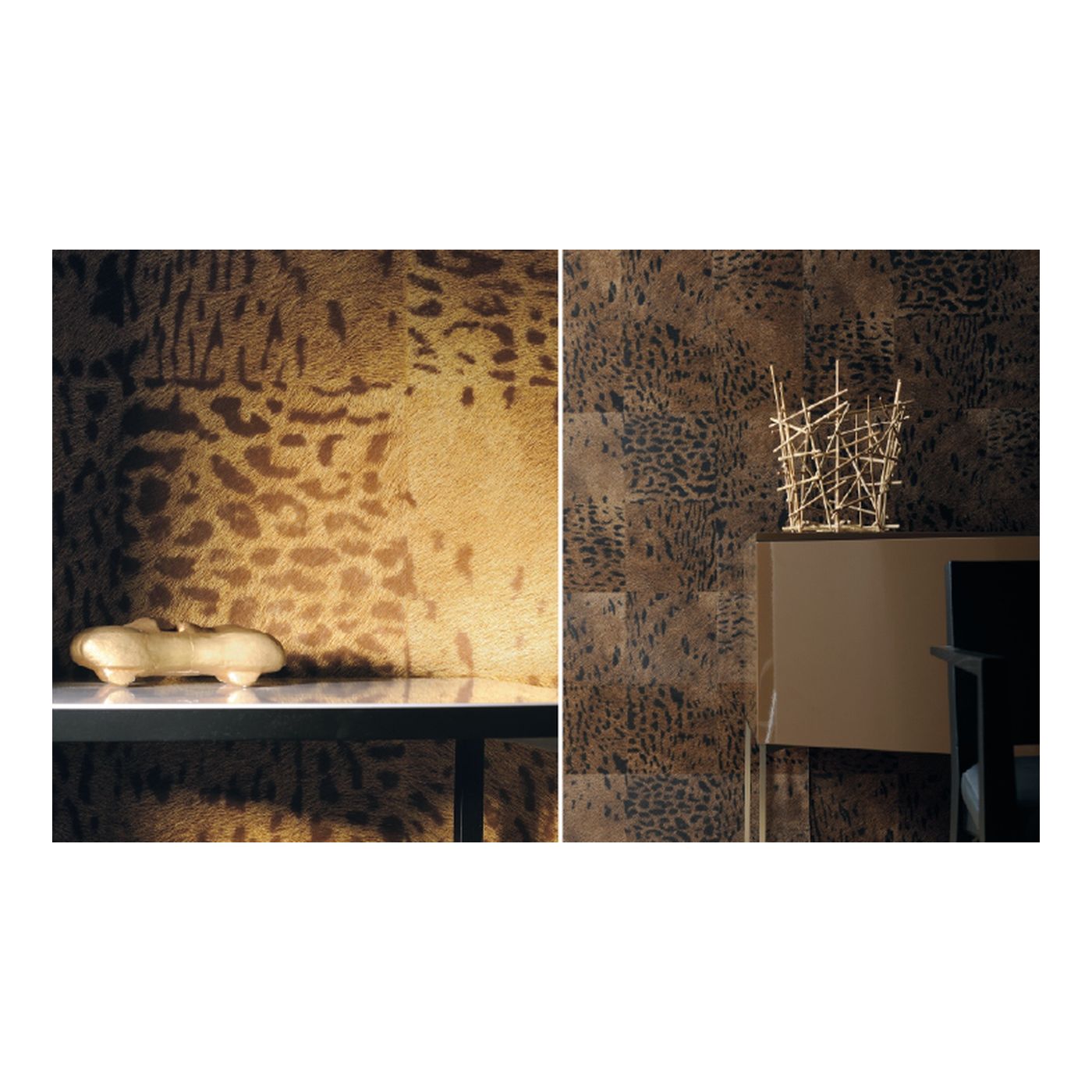 Entre lince y leopardo, una espléndida piel presentada en piezas cuadrangulares con tintes ocres