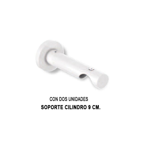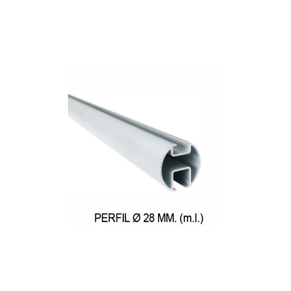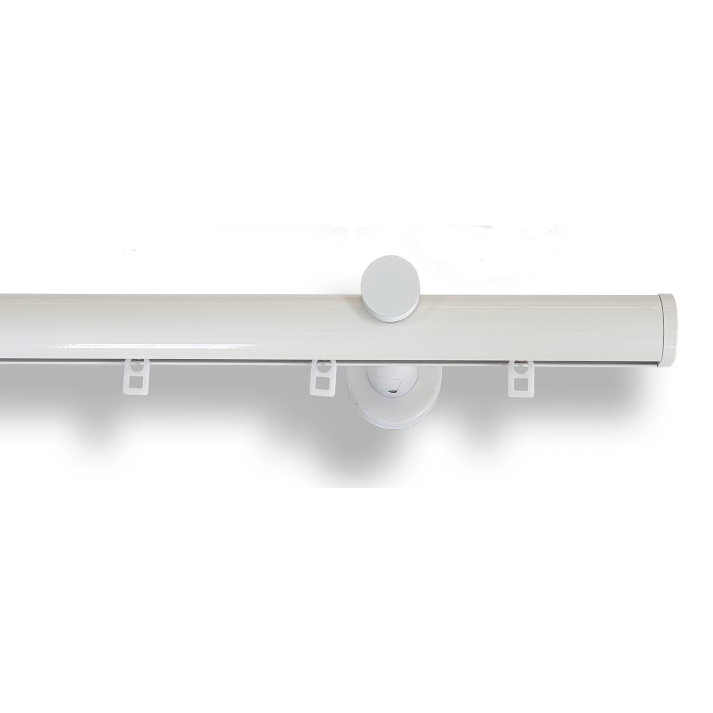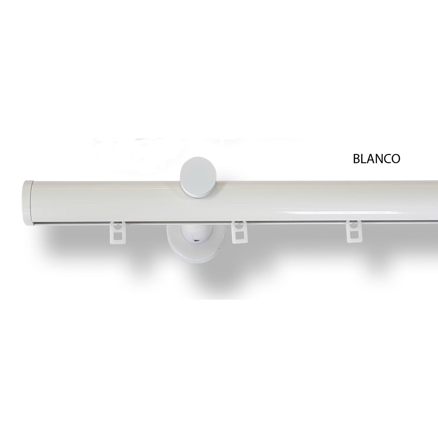 Riel redondo muy decorativo de 28 mm de diametro, en aluminio color blanco, soportes a pared y terminal tapón