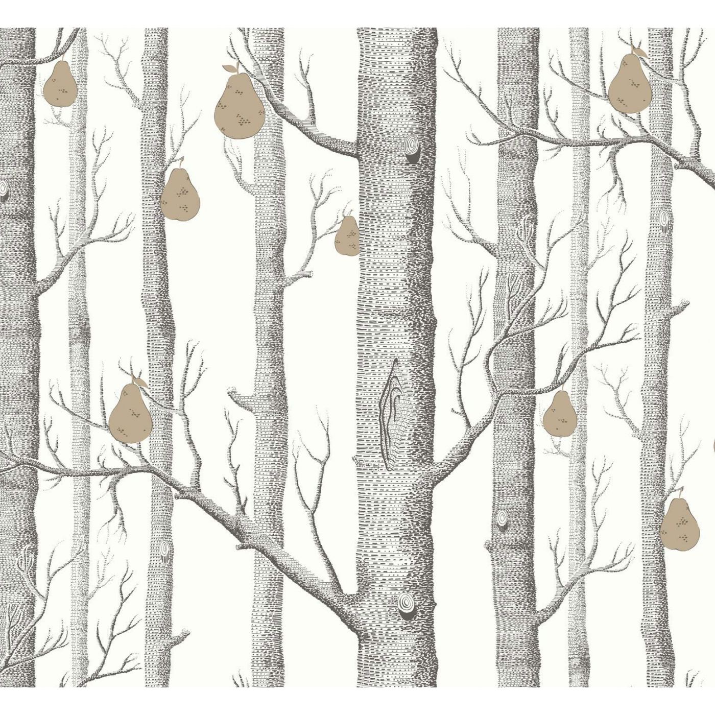 El icónico diseño de papel pintado de Cole & Son Woods con un bosque de árboles, ha dado fruto; peras doradas en brillantes tonos metálicos se han impreso en tonos de gris crepuscular, blanco nublado y negro medianoche.