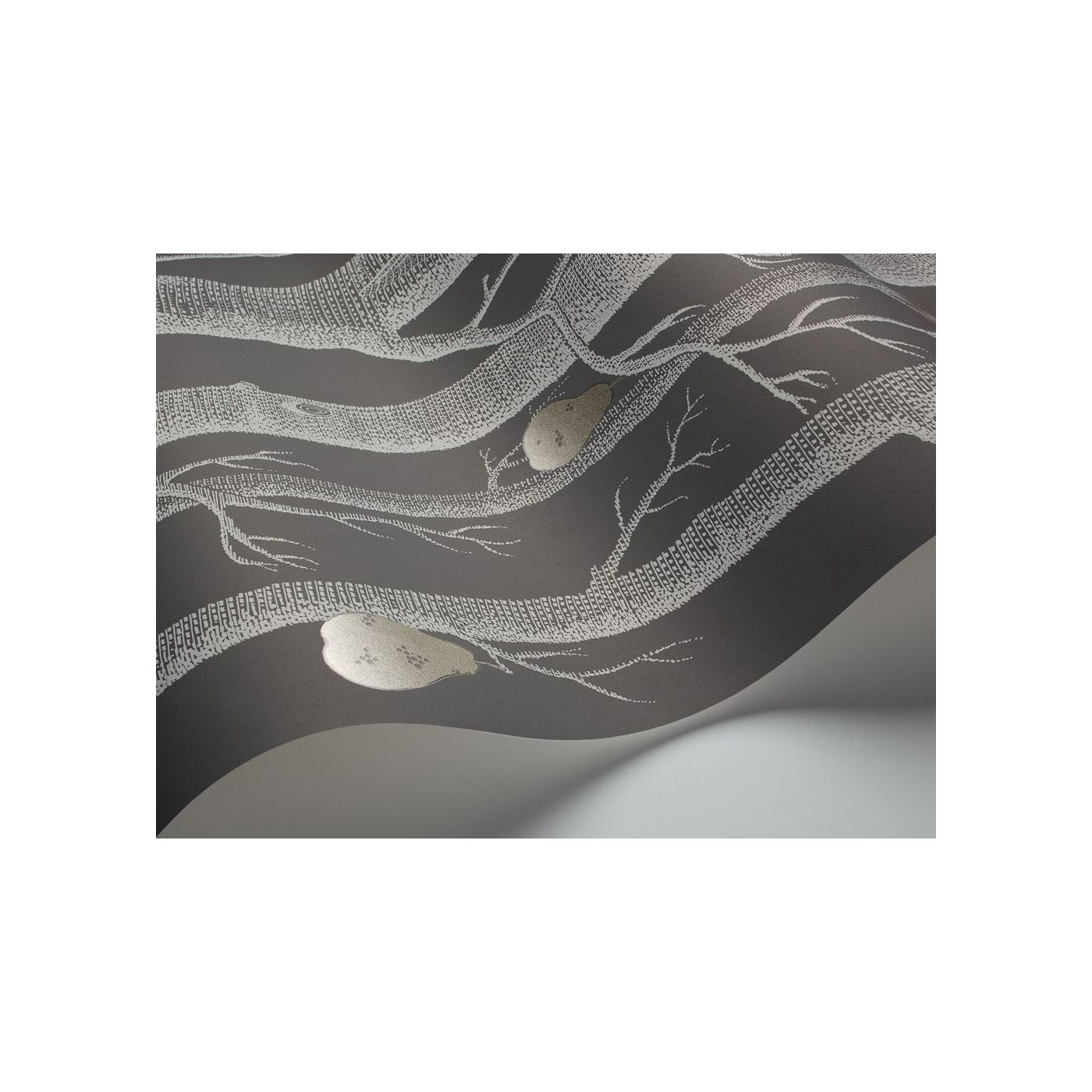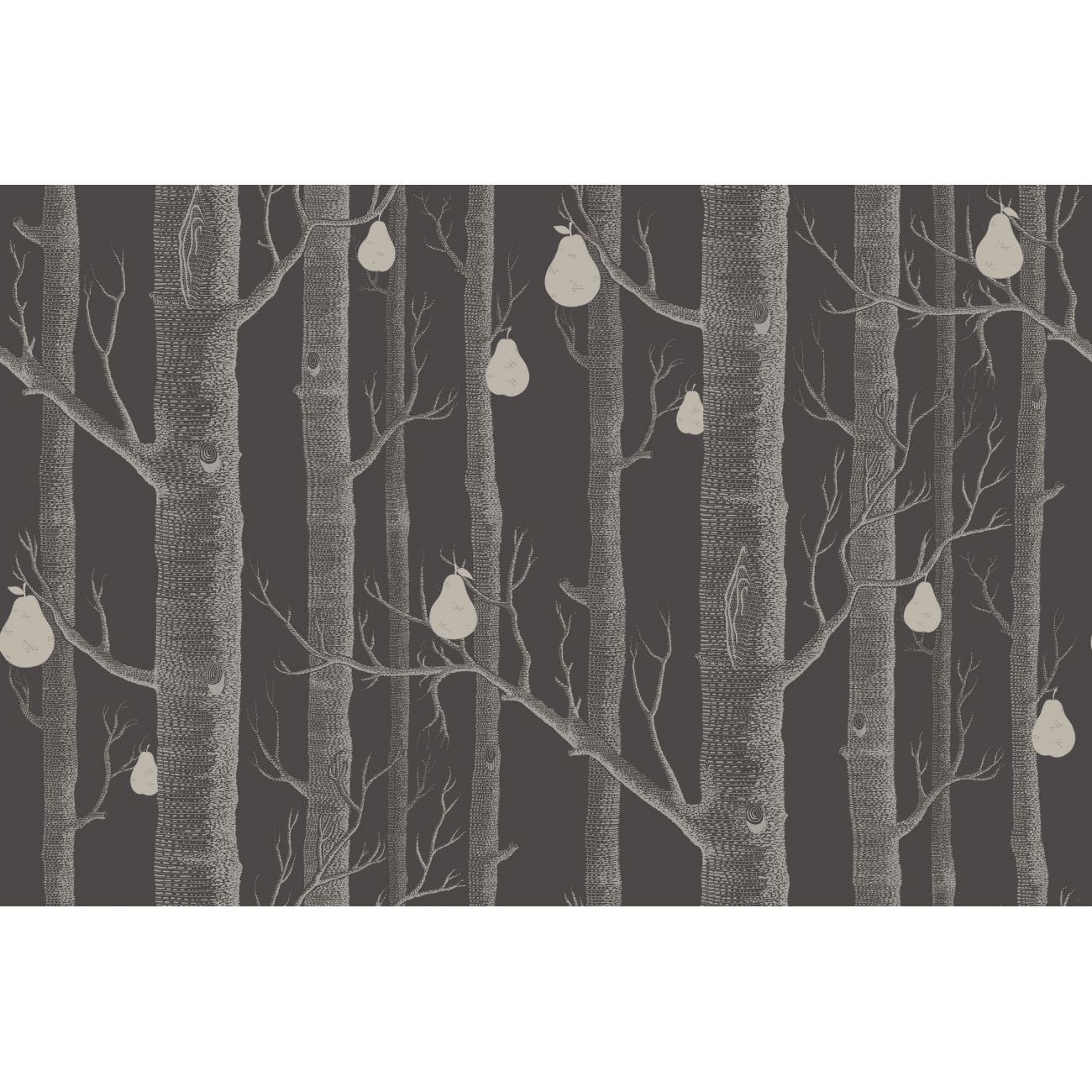 El icónico diseño de papel pintado de Cole & Son Woods con un bosque de árboles, ha dado fruto; peras doradas en brillantes tonos metálicos se han impreso en tonos de gris crepuscular, blanco nublado y negro medianoche.