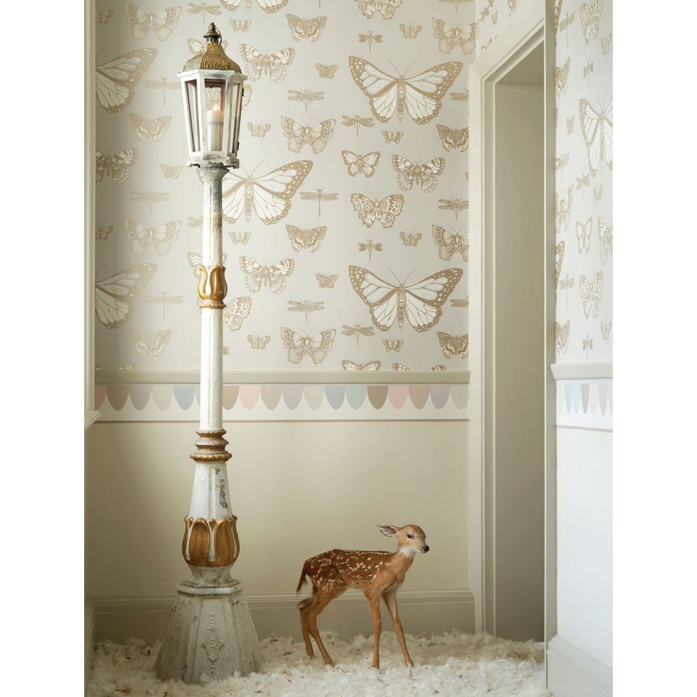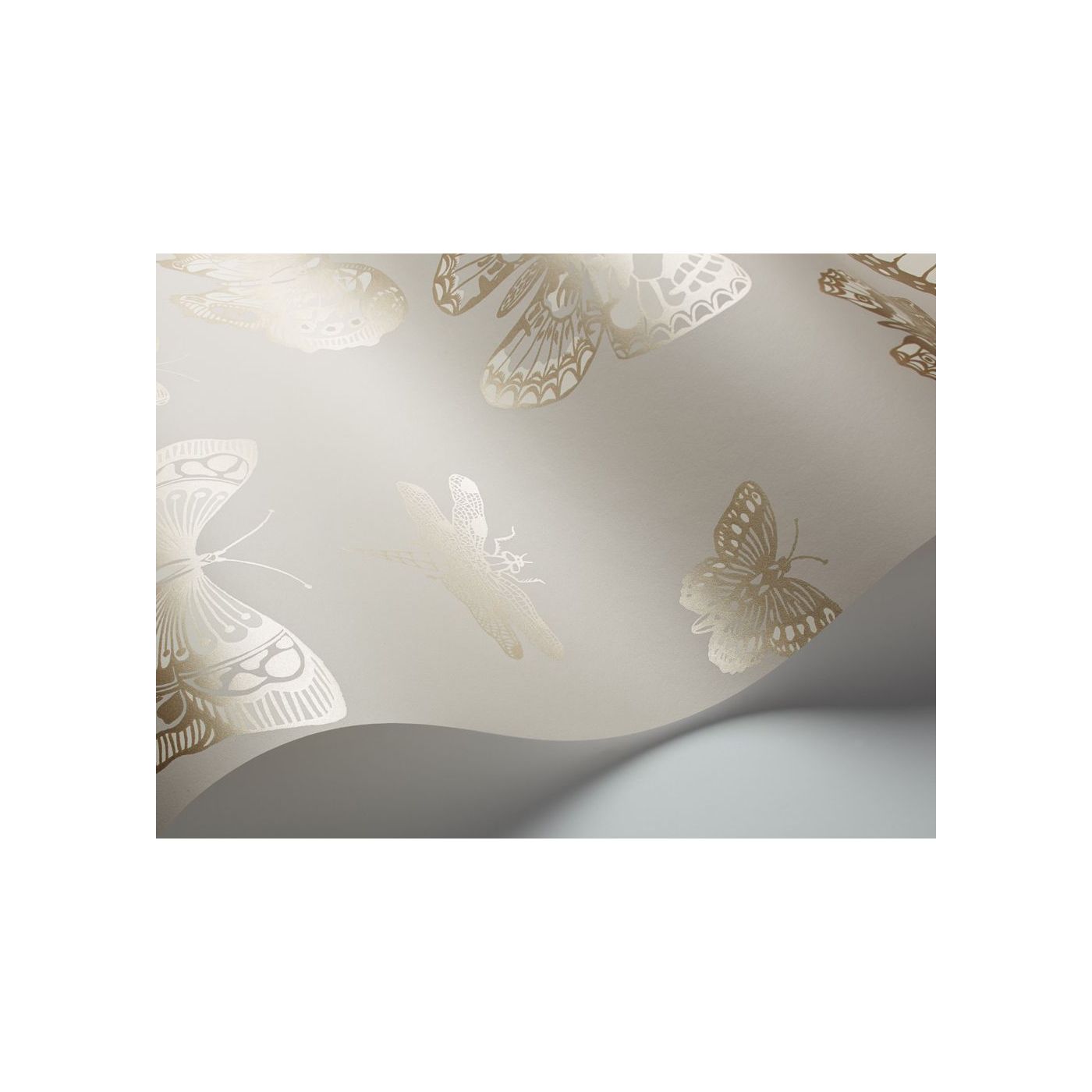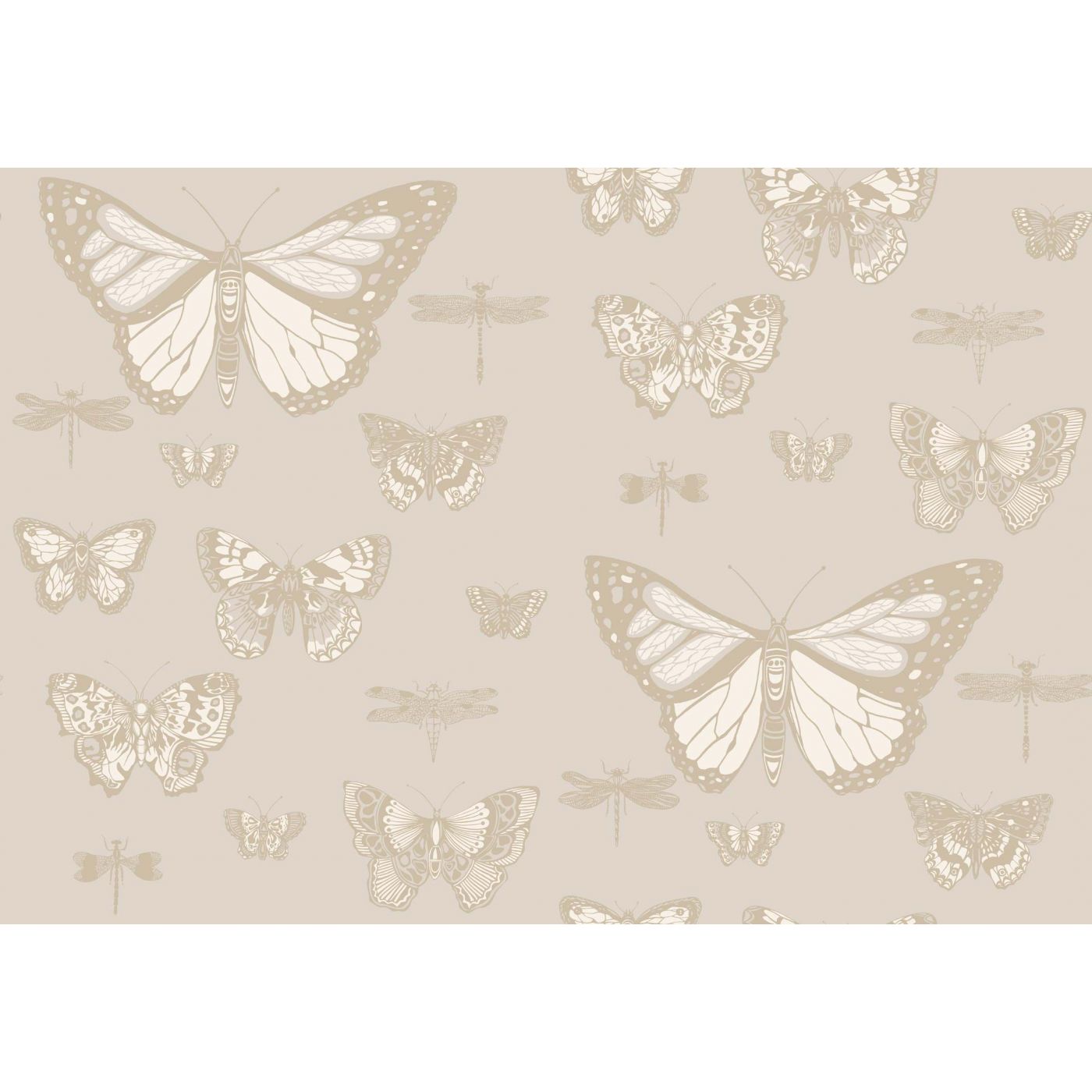 Tomado de los archivos Cole & Son, este elegante diseño sorprende con su escala. Cuenta con grandes mariposas gráficas y libélulas en reluciente metal sobre fondo neutro y fresco.