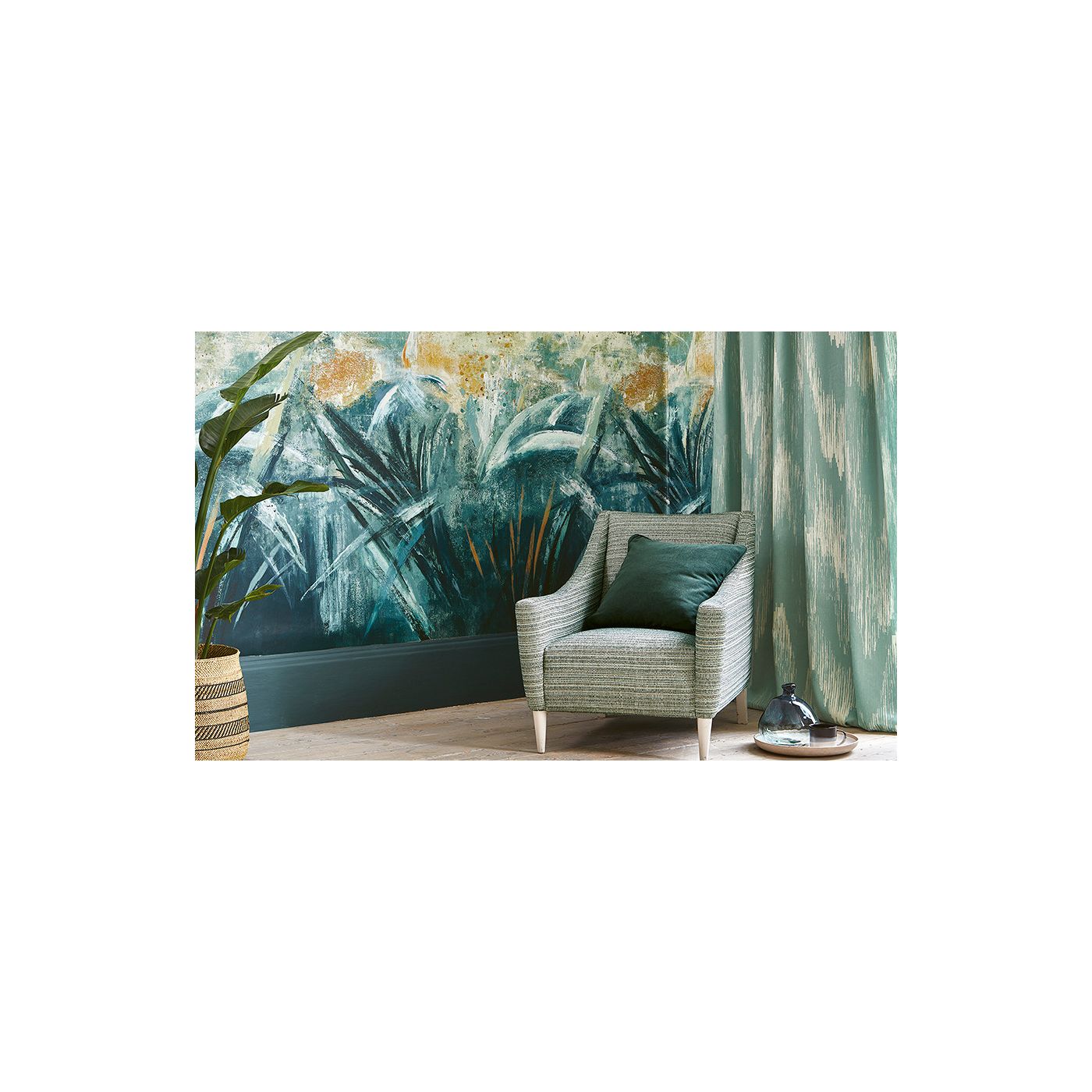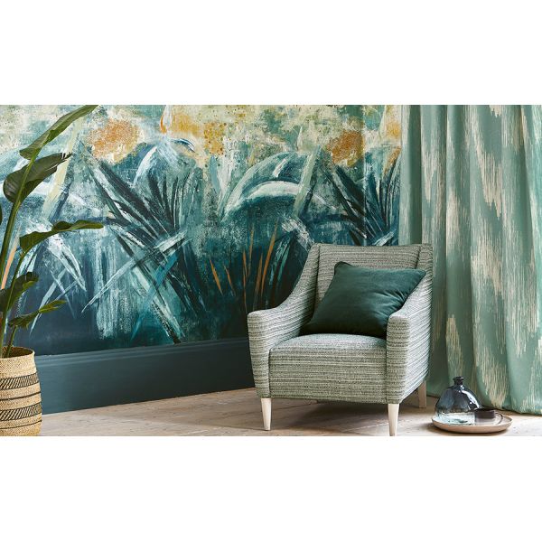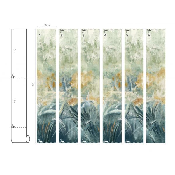 Representando una escena de un invernadero abstracto, este diseño está pintado con pinceladas seguras que capturan la naturaleza orgánica, espontanea y silvestre. Pastos pictóricos dan paso a parches de apariencia nublada de colores pasteles relajantes.